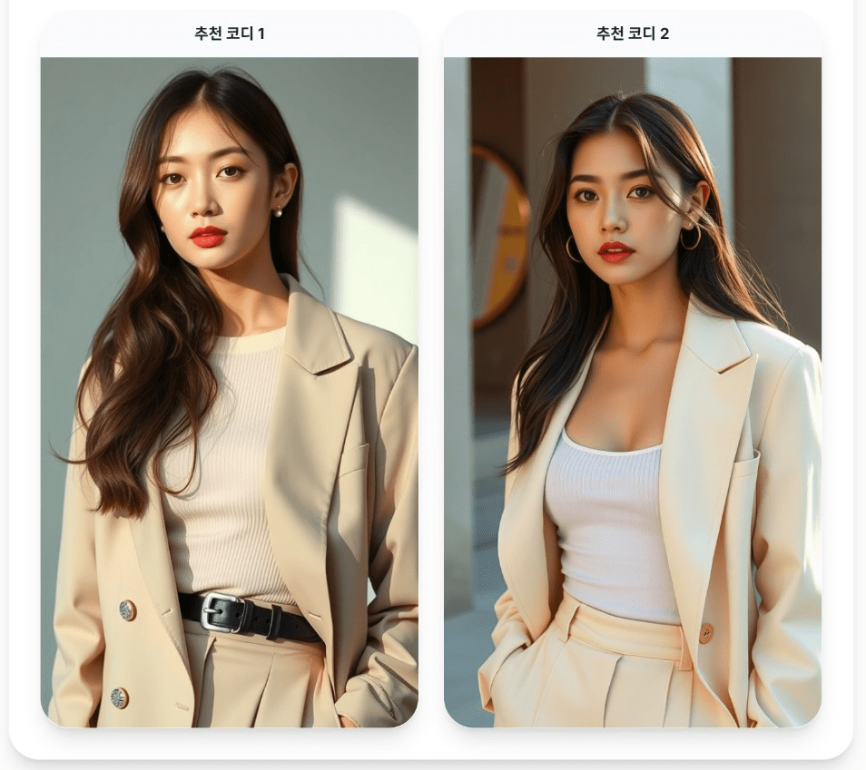 극단적인 노출은 줄였으나, 브라탑 제거 등의 결과 수정은 프롬프트로 통제 가능한 영역이 아니었습니다. 같은 조건에서도 계속 결과가 바뀌었는데, 입력 이미지/퍼스널 컬러 차이에 따른 이미지 모델(fal-ai FLUX/schnell)의 랜덤성이었습니다.